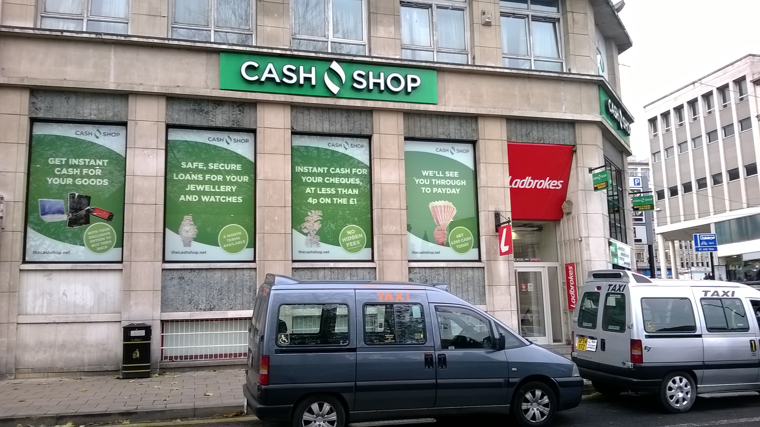 These images are taken across either side of a small square in Sheffield, England. The top image shows a small run of five shops; three bookmakers, another gambling establishment and a payday loan shop. The bottom image is taken across the road and a large payday loan shop has a bookmakers in the same building.